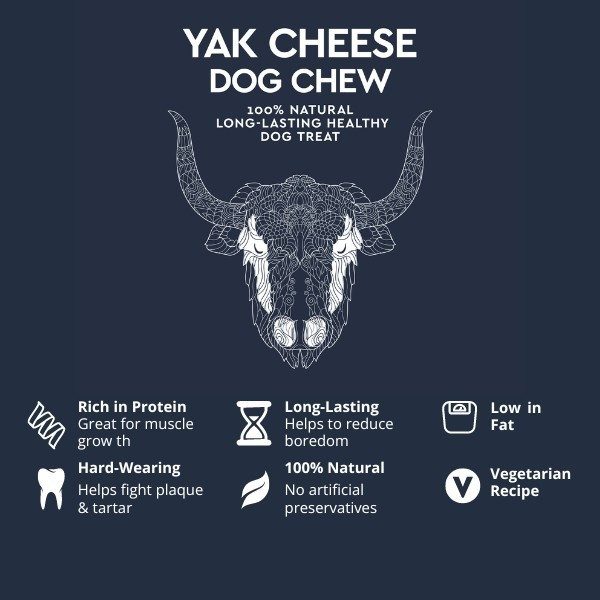 The addition of banana adds many potential benefits for dogs as it is an excellent source of natural vitamin C and B6. Which, can aid with brain development and help to boost immune system. These long-lasting and delicious chews are handmade from authentic and rare yak cheese in the Himalayas. Air-dried and smoked to perfection. These nutritious bars are completely natural, low in fat, and do not contain any artificial flavouring or preservatives. They are rich in protein, hard-wearing (perfect for helping to fight plaque and tartar), plus they will keep a dog engaged for hours.